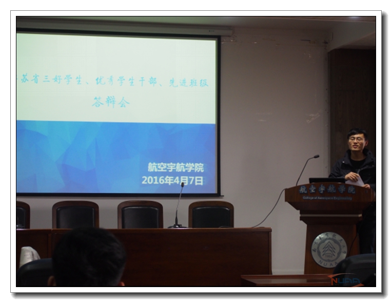 4月7日下午,航空宇航学院2015年度省级“三好学生”、“优秀学生干部”、“先进班级”答辩在我校明故宫校区18号楼529顺利开展。学院辅导员刘希、朱赫、王宁均到场,辅导员卢一亭和许俊勇作评委。 本次公开答辩响应了省教育厅和共青团江苏省委在全省高校开展省级“三好学生”、“优秀学生干部”和“先进班集体”的评选活动,共有我院12级和13级的十几位优秀的同学参与,14级、15级的同学也有部分代表到场旁听。