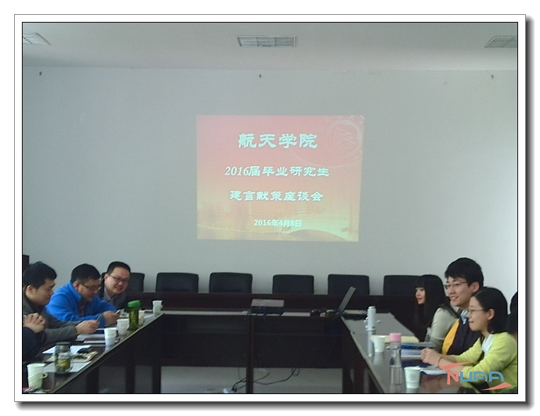 话离别,情系母校恩;谋发展,共筑航天梦。4月8日上午,航天学院在明故宫校区A3-318会议室召开2016届毕业研究生建言献策座谈会。航天学院党委书记季海群、副院长于敏、航天控制系都延丽、信息系孔繁锵、空间系全荣辉、微小卫星工程技术研究中心康国华、吴云华以及2016届毕业研究生代表参加了本次建言献策座谈会。座谈会由学院研究生辅导员管永星主持。