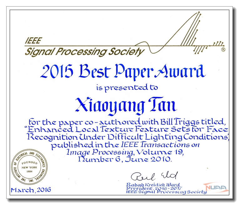 2016年3月22日,在上海召开的IEEE ICASSP国际学术会议上,我校计算机学院谭晓阳教授获2015年度IEEE信号处理协会(SPS)最佳论文奖,是首位以国内大学为第一作者单位获此荣誉的大陆学者。 ![]() 该奖项遴选自IEEE SPS 下属IEEE Transaction期刊及信号处理相关学术期刊于2010年到2015年期间发表的所有学术论文,以表彰其所取得的“罕有好成绩”(Exceptional Merit)。谭晓阳教授于2010年发表于IEEE Transaction on Image Processing的期刊论文“Enhanced Local Texture Feature Sets for Face Recognition under Difficult Lighting Conditions”获得该奖项。该论文还入选了ESI高被引论文。 ![]() ![]()