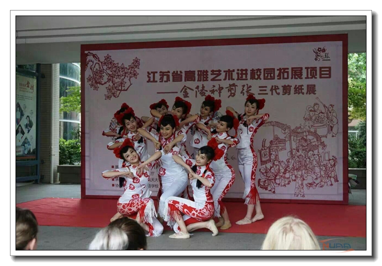 上午10点,我校艺术学院的学生们表演的舞蹈《剪纸姑娘》拉开了开幕式的序幕。剪纸风格的服装、活泼俏皮的舞蹈、明媚的笑容……姑娘们精彩的表演赢得了南京外国语学校的师生们的一致好评。外国留学生们也对这充满了中国特色的舞蹈表示出了极大的兴趣,看得非常认真。