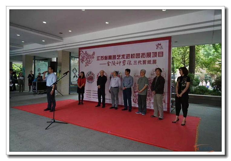 5月5日上午,由我校举办的“金陵神剪张”三代剪纸展开幕式暨“高雅艺术进校园”活动在南京外国语学校成功举行。省教育厅体卫艺处处长张鲤鲤,省教育厅体卫艺处副处长王红蕾,南京航空航天大学党委副书记、副校长陈夏初,南京剪纸国家级非物质文化遗产代表性传承人、江苏省工艺美术大师张方林,南京外国语学校党委书记刘前树,南京外国语学校校长邹正,南京航空航天大学艺指委秘书长杨莉莉出席了开幕式。