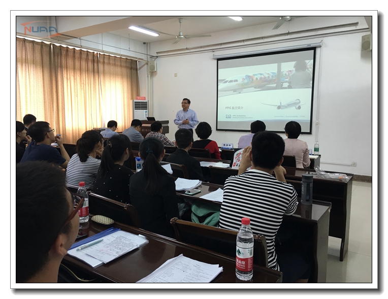 答辩会伊始,材料学院院级科创基金赞助单位PPG公司代表高正强博士上台致辞。他为大家详细介绍了PPG公司的发展历程,以及公司目前在全球范围内的布局及主要业务。作为PPG苏州航空事业部的负责人,高博士列举了PPG在波音787、中国大飞机C919等方面所做的工作,并与同学们一起深刻剖析了现今航空业现状,指出航空事业的发展离不开富有创造力的青年人,并代表PPG表达了对南航材料学院学生开展科技创新工作的大力支持。