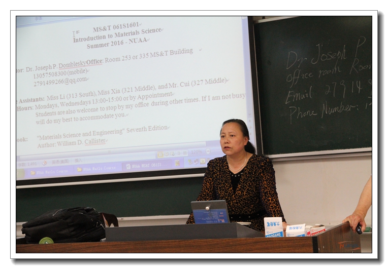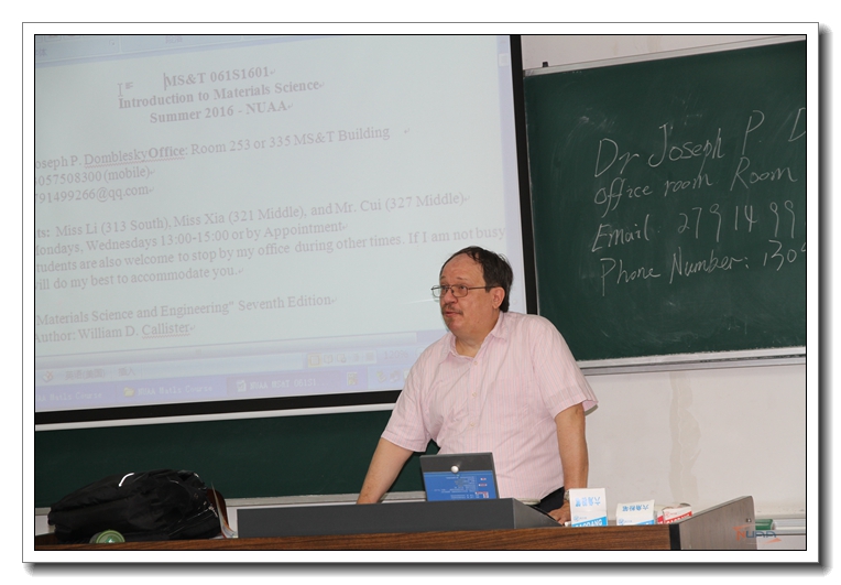 2016年5月19日,材料科学与技术学院开设第二门全英文国际化课程,聘请来自马凯特大学(Marquette University)的外籍教师Joseph P.Domblesky副教授,在将军路校区为材料科学与工程专业2013级学生开设《材料科学与工程》课程。材料科学与技术学院教学院长梁文萍,李玉芳副教授,来自卓越班、培优班以及保研的58名学生听授了此次课程。 课程伊始,副院长梁文萍首先对Dr.Domblesky的到来表示热烈欢迎,她指出,学院非常重视国际化课程的开设,花费了大量的时间与精力联系安排课程相关事宜。国际课程采用全英文授课的方式,让学生既可以学到专业课知识也能提高外语水平,更主要的是体验外教的教学理念、授课方式,尝试新的学习方法,拓宽国际视野,为以后的学习和工作奠定扎实的专业基础,希望同学们珍惜此次教学资源和学习机会。为保证课堂质量,学院特配助教李玉芳副教授,助手夏金娇、崔世宇博士,帮助学生解答课堂疑问。