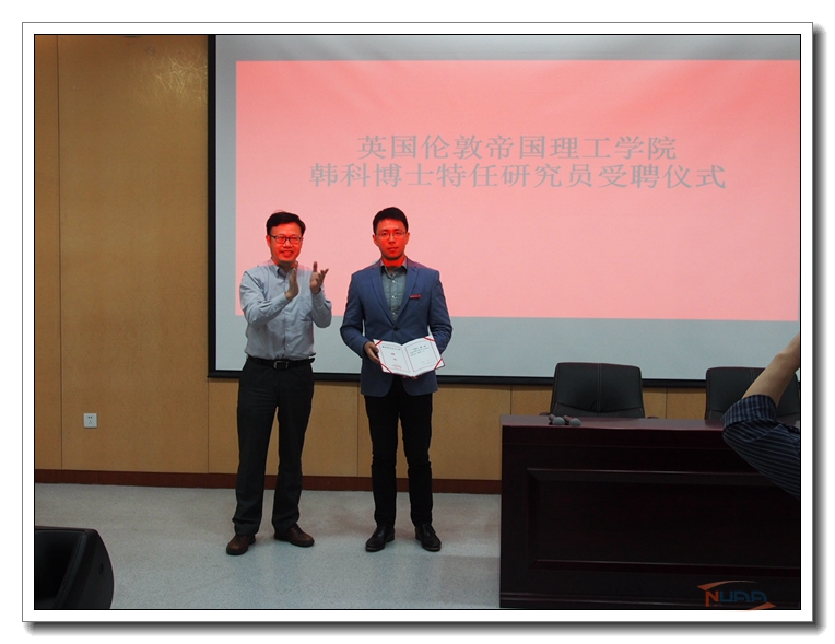6月1日下午,我校在将军路校区图书馆报告厅举行特任研究员签约暨授聘仪式,英国伦敦帝国理工学院韩科博士受聘为我校特任研究员。校高级人才管理办公室主任孙建红、民航学院院长胡明华、副院长葛红娟及民航学院部分师生参加了仪式。仪式由葛红娟主持。