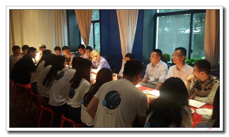2016年6月7日晚上,适逢2016届毕业生即将奔向新起点之际,航天学院在南航奶酪时光店内举行了“院长书记有约”的茶话会活动,院长陈卫东、党委书记季海群、党委副书记李和新出席,与辅导员徐伟证和21位学生代表畅聊学生个人成长,共话学院发展规划,一起抒发航天人的情怀。