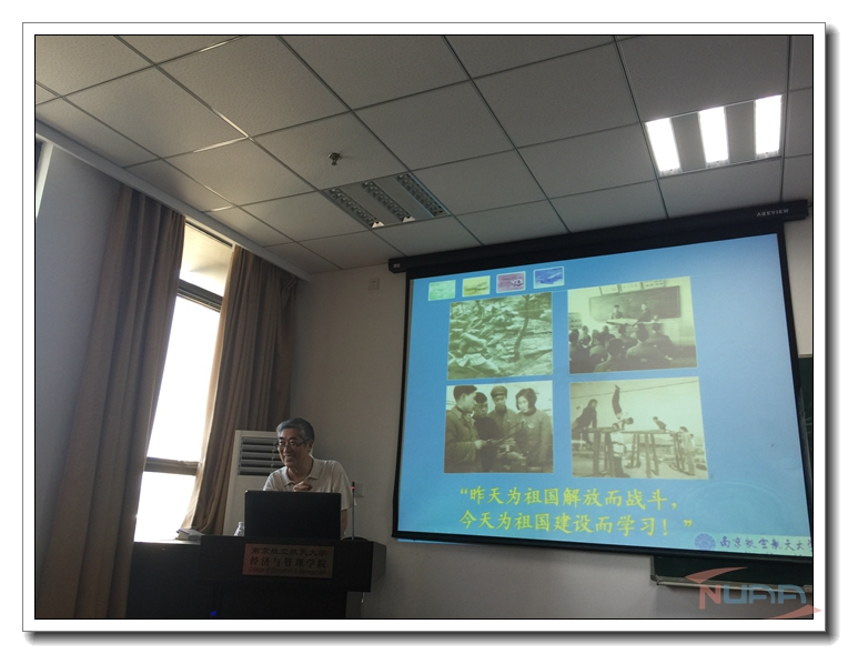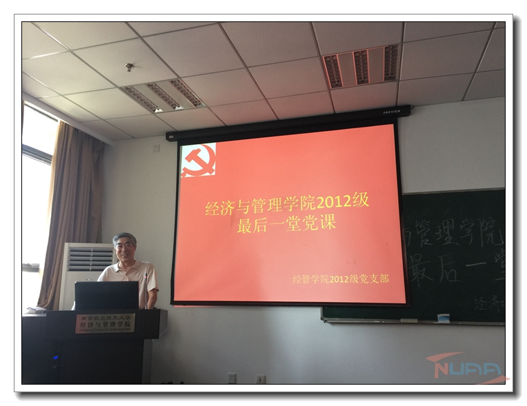 6月14日下午,我校关心下一代工作委员会常务副主任丁荣茂老师为经济与管理学院毕业班党员上最后一次党课,主题为“民族复兴大目标,人生发展大舞台”,经管学院2012级本科生党员及入党分子积极参与了此次活动。这次党课旨在让同学们重温党员责任,肩负时代使命,投身社会建设。 丁荣茂老师首先结合当下的热点“两学一做”提出在民族复兴大目标下青年学生要认真学习,时刻铭记为祖国建设而学习;其次通过分析经济发展新常态,激励同学们要时刻保持民族自豪感,要牢记使命责任,助力中华民族的伟大复兴;最后通过青年党员责任担当的表现阐述了在新的时代背景下青年党员应该以祖国的发展为己任,丁老师通过建校的第一批学生的艰苦事迹,到一批一批优秀校友的故事教导我们,我们都要以南航为骄傲,时刻牢记为国家贡献自己的力量,将来南航也会以我们为骄傲。在场的同学也纷纷感叹丁老师的敬业和奉献,73岁的他全程站着为同学们上完最后一次党课,退休12年来笔耕不辍,写出两万多字的心得讲义等,为新生、毕业生、国防生、新入职教师们开展讲座400多场。