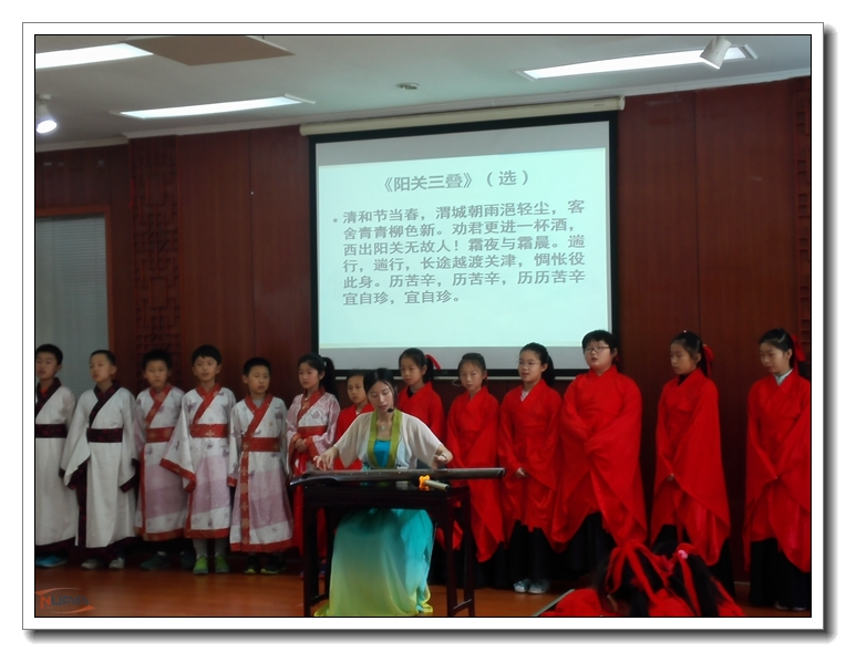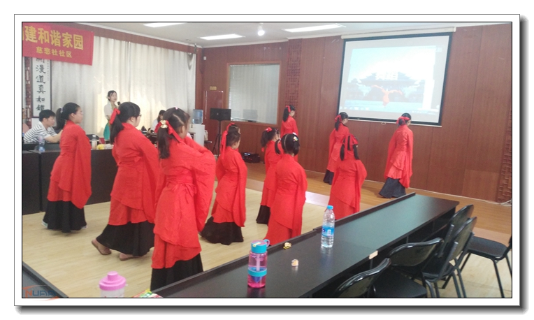 了解国学堂概况后,团队与社区的孩子、家长一起参与了本学期最后一次国学课。在这一堂“特殊”的国学课上,孩子们身着汉服,背诵《逍遥游》、千字文,吟唱琴歌《阳关三叠》、《秋风词》以及老师原创的古风歌曲《雅乐寻踪》,表演武术、舞蹈,全场一派和谐景象。