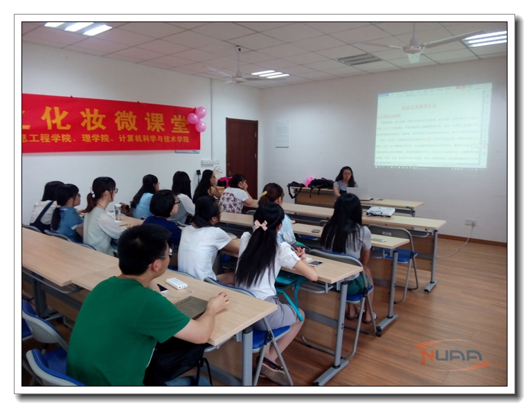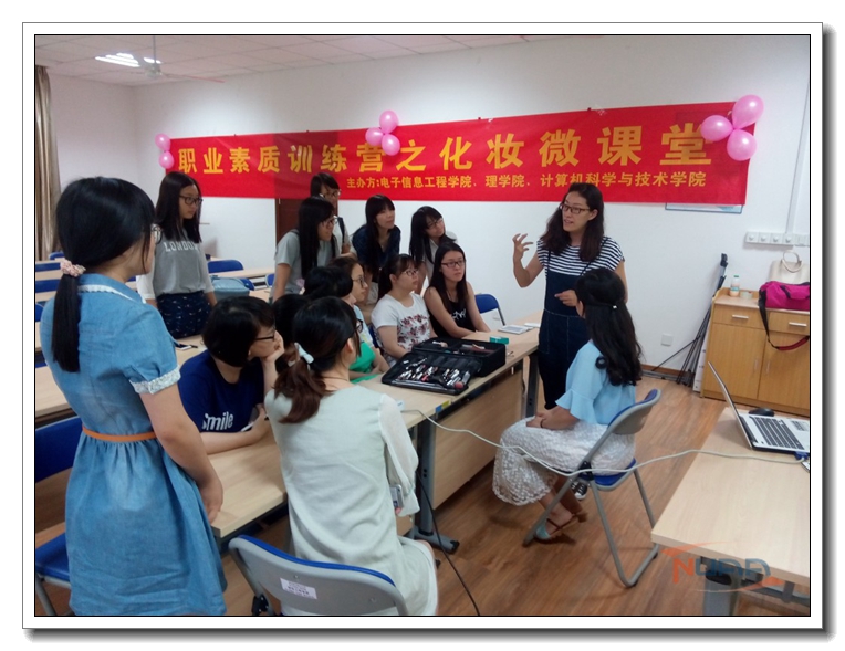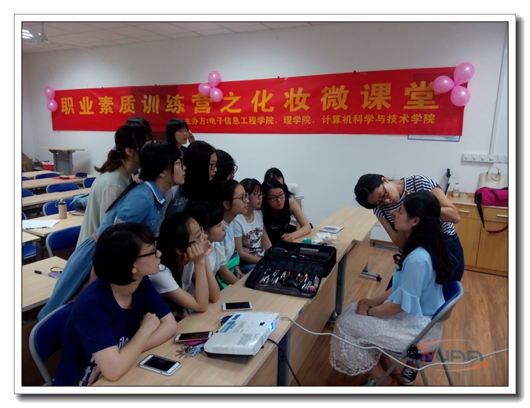 6月15号,电子信息工程学院、理学院、计算机科学与技术学院合办的职业素质训练营之化妆微课堂活动在电子信息工程学院102教室举行。本次活动邀请到了我校艺术学院的王雯婷老师到场为同学们指点面试妆容。王老师毕业于上海戏剧学院,现任南京航空航天大学艺术学院及南京艺术学院专业人物整体造型课程教师。