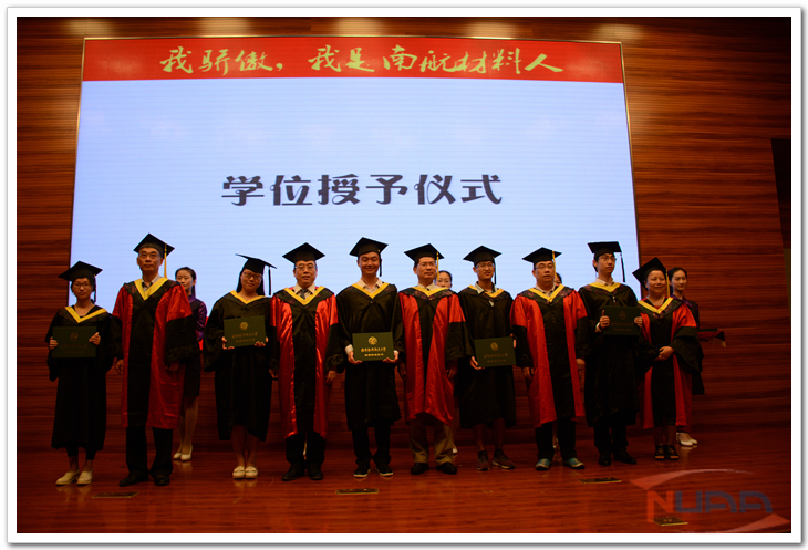 随后,院党委副书记黄彬主持毕业生学位授予仪式。在全体师生合唱国歌之后,由院学位评定委员会主席陶杰教授宣读学位授予决议,周克印教授、姚正军教授、陶杰教授、汪涛教授、梁文萍教授为294名毕业生颁发毕业证书,并合影留念。毕业典礼暨学位授予仪式以合唱南航校歌结束,铿锵有力的歌词激励着每一位毕业生,坚持梦想,不忘初心,成为真正的高素质公民和未来开拓者。