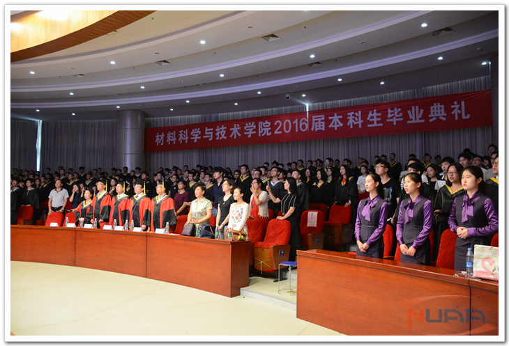 6月21日上午, 材料科学与技术学院2016届本科生毕业典礼暨学位授予仪式在南航将军路校区一号楼四楼报告厅举行。院党委书记周克印教授、院长姚正军教授、学位评定分委员会主席陶杰教授、院党委副书记黄彬老师、副院长汪涛教授、副院长梁文萍教授、孔祥浩老师出席了典礼。院学位评定委员会委员、各系导师代表、部分家长代表、各年级辅导员及294名2016届本科毕业生参加了毕业典礼暨学位授予仪式。