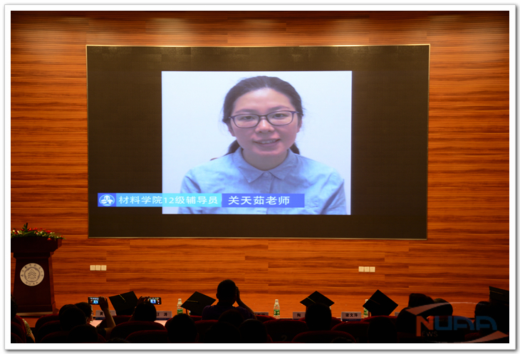 郭珺的妈妈作为家长代表回顾了女儿大学四年的成长,感谢老师的谆谆教诲和悉心栽培,感谢辅导员的心灵辅导和辛勤工作,感谢同学们的真诚友情和一路陪伴。同时,以学生家长的身份对毕业生们表示祝贺。陪伴了学生四年的关天茹老师因为休产假,不能到现场参加典礼,特意为学生录制了视频,和各专业老师们一起通过视频向各位毕业生送出祝福与希望,短短的话语,承载的是老师们对学生们深深的爱与由衷的祝福。