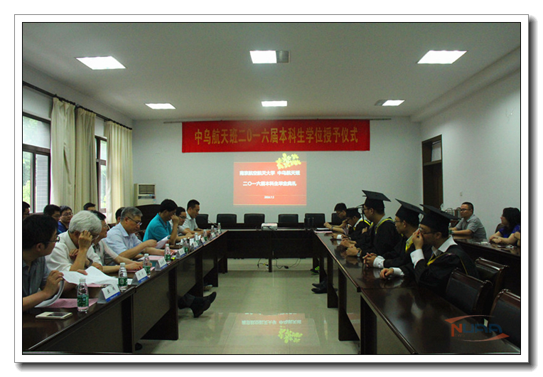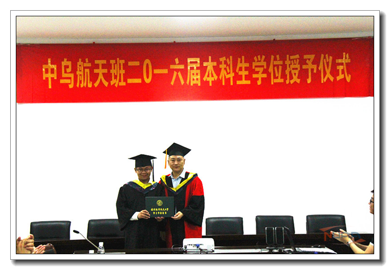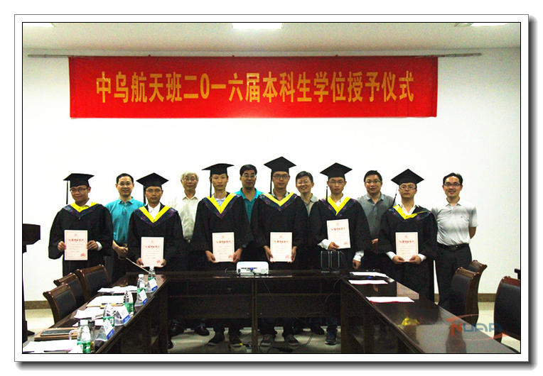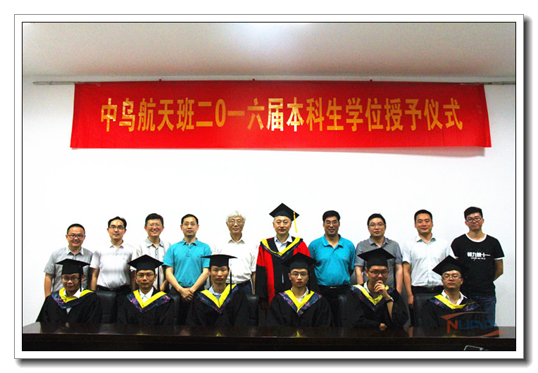7月2日下午,我校中乌航天班2016届本科生毕业典礼暨学位授予仪式在明故宫校区A3-318会议室举行。国际合作交流处处长金泉元、国际教育学院院长何宁、学校教务处副处长王敬东、党委宣传部副部长孔令华、学生处副处长张鹏等职能部门领导以及航天学院院长陈卫东、院党委书记季海群出席仪式,中乌航天班2016届毕业生以及2015级中乌航天班全体同学参加了仪式。仪式由航天学院党委副书记李和新主持。