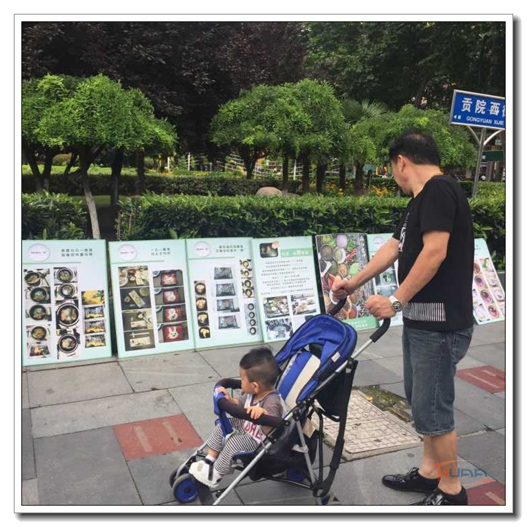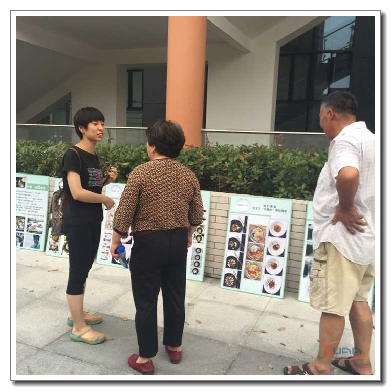 6月30号早上8点,团队成员拿着以“残羹剩饭变作品”为主题的10张展板前往老门东进行公益宣传。为了不浪费路上巨大的客流量,他们把展板正面向前拿着走路。从一开始的不好意思到越来越多的人停下来看展板,开始主动向行人宣传、“每停下来一个人对我们来说都是动力。”