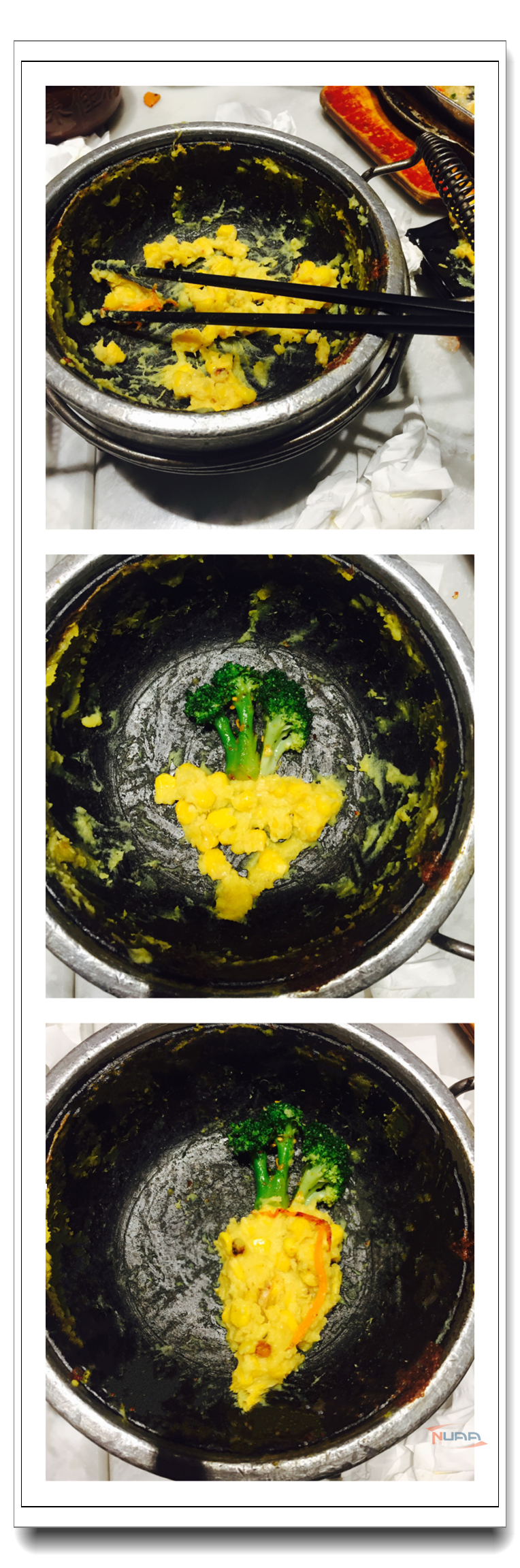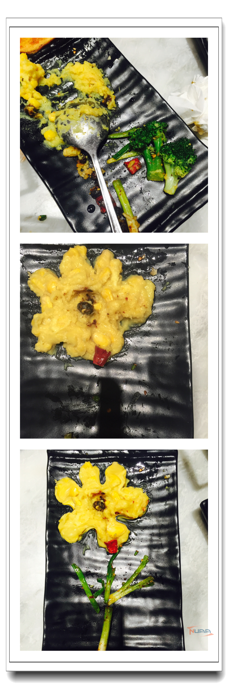 在实践活动中,来自南航艺术学院环境设计专业大一的7名成员在快餐店、甜品店、中式餐厅、日料店、自助餐厅等多种餐饮场所进行实地考察,共拍摄作品28套,共计照片98张。队员们按照剩菜的多少、颜色、形状摆造型:有的是一朵五瓣花,有的是一个大大的笑脸,有的是一根Q版的胡萝卜……