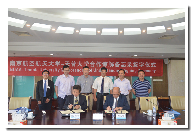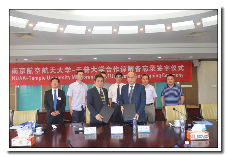 随后,天普大学与南京航空航天大学合作谅解备忘录的签字仪式在明故宫校区举行。黄志球副校长和Jie Wu副教务长分别代表各自学校签署了合作备忘率。黄校长在致辞时表示两校在近几年开展了深入交流,尤其是在计算机学科方面已建立起了深厚的友谊和良好的合作基础,前期已经在科学研究方面取得了初步成效,相信随着两校合作领域的不断深化和广化,必将迎来更加美好的发展前景。Jie Wu教授对南航一直以来为两校联合发展所做出的努力和付出的劳动表示感谢,也预祝两校合作交流更上一层楼。