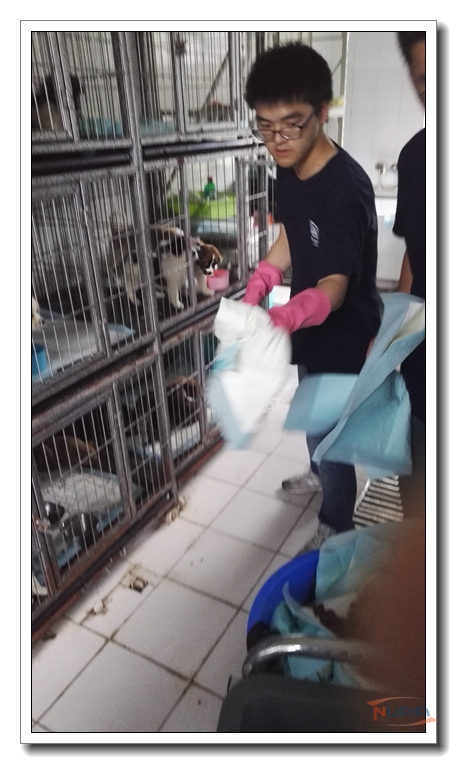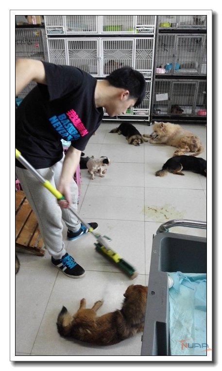“‘狼外婆’是最近救助的一只狗,因为头上裹着白纱布,加上每次打针时都龇牙咧嘴,满脸惊恐状,那模样就像是童话故事小红帽里的狼外婆一样,所以大家给它取名’狼外婆’……”向记者作介绍的这个小伙子,是来自南京航空航天大学航空宇航学院的男生刘祚廷。在过去的九天里,来自南航的7个小伙子一起去往南京平安阿福流浪动物救助中心,为小动物们做起了贴心的“男保姆”。