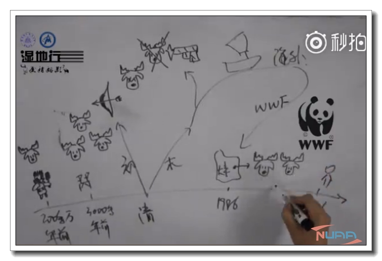“麋鹿这家伙有着“四不像”的怪名,脸似马、尾似驴、颈似骆驼、角似鹿,你更不知道的是,这家伙还喜欢泥浴,最擅长的是游泳。”伴随着诙谐幽默的语言与快节奏的配乐,视频画面出现了简笔画成的麋鹿,头、尾、颈、角被标注出来,最后麋鹿脚下出现了一道道波浪,暗示它擅长游泳。