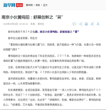 近期,新华社、人民日报、光明日报等中央主流媒体集中报道了我校大学生科技创新典型人物黄鸣阳的事迹。黄鸣阳,我校航空宇航学院飞行器设计专业2015级研究生,黄鸣阳本科期间就曾主持和参与完成了12项创新项目,发表了2篇学术论文,成功研制出了国内全新的仿生海鸥扑翼飞行器,两次荣获全国大学数学建模竞赛一等奖,并曾入选江苏“好青年”百人榜和“2014年江苏省大学生人物”,2016年当选中国大学年年度人物。现将相关报道转载: