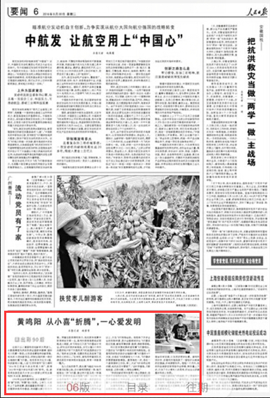 8月24日,新华社报道《南京小伙黄鸣阳:舒展创新之“翼”》 ![]() 8月25日,《光明日报》第四版“出彩90”栏目《黄鸣阳:科学带给我快乐》 ![]() 《人民日报》8月30日报道《黄鸣阳:从小喜“折腾”,一心爱发明》 ![]()