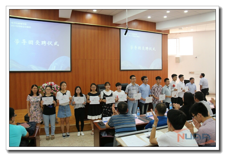 随后,张卓、王英两位副院长向12名大二年级优秀学生组成的新生学导团颁发了聘书,感谢他们对新生的指导和帮助,同时也希望他们不辱使命,肩负责任,一起陪伴新生更好的成长,促进学院更好的发展。焦宏图书记和周德群院长共同赠与本科生每人一本由经管学工团队编著的《如何读大学》,研究生每人一本《中国哲学简史》,勉励同学们“掌握理性力量,成就精致人生”。