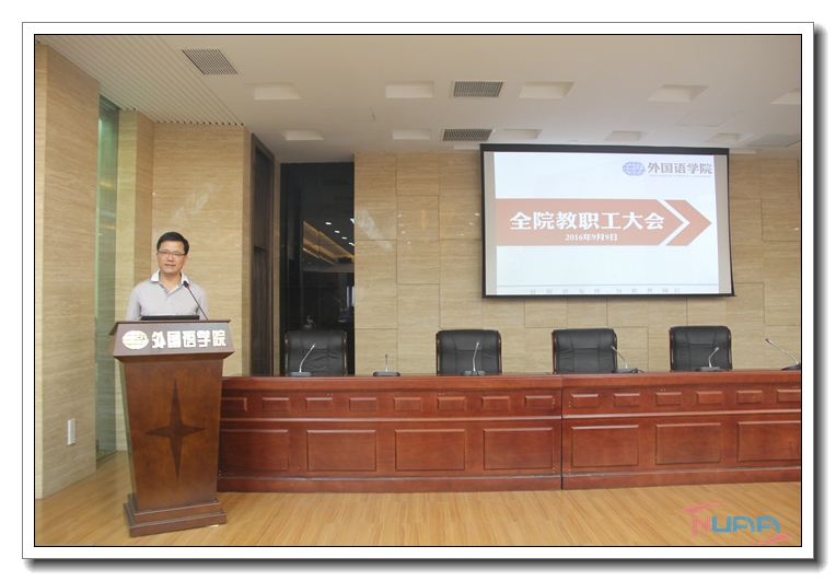 9月9日,外国语学院召开新学期第一次全院教职工大会。学院领导班子成员和全体教职工参加了大会,会议由院党委书记刘健荣主持。 会上,院长范祥涛传达了校第十五届党委第十七次全委(扩大)会议精神。他依次对学校三位副校长所做的学科建设、科技工作、人事工作三个专题报告的重点要点进行了详细解读,认为三个专题报告联系紧密,其内在一致的目标在于建设一流的大学、一流的学科;重点传达了聂宏校长工作报告中对于学校改革发展内外形势的分析以及如何突破改革发展难点的举措和思路;重点解读了郑永安书记总结讲话中对学校“十三五”规划和“双一流”建设等重点工作提出的几点意见。范院长指出,学校“双一流”建设、校内综合改革与每位老师的个人发展紧密相关,老师们要汇聚共识,强化责任感、使命感、归属感和荣誉感,为学校稳步推进改革贡献力量。随后,范院长深入分析了学院所面临的形势和任务,他强调学院要坚持改革发展的目标,加强学院师资队伍建设,优化专业建设,加强教学研究,落实教学改革,强化团队建设,提高科研产出,希望每一位老师都能积极参与到学院改革发展的各项事业中。