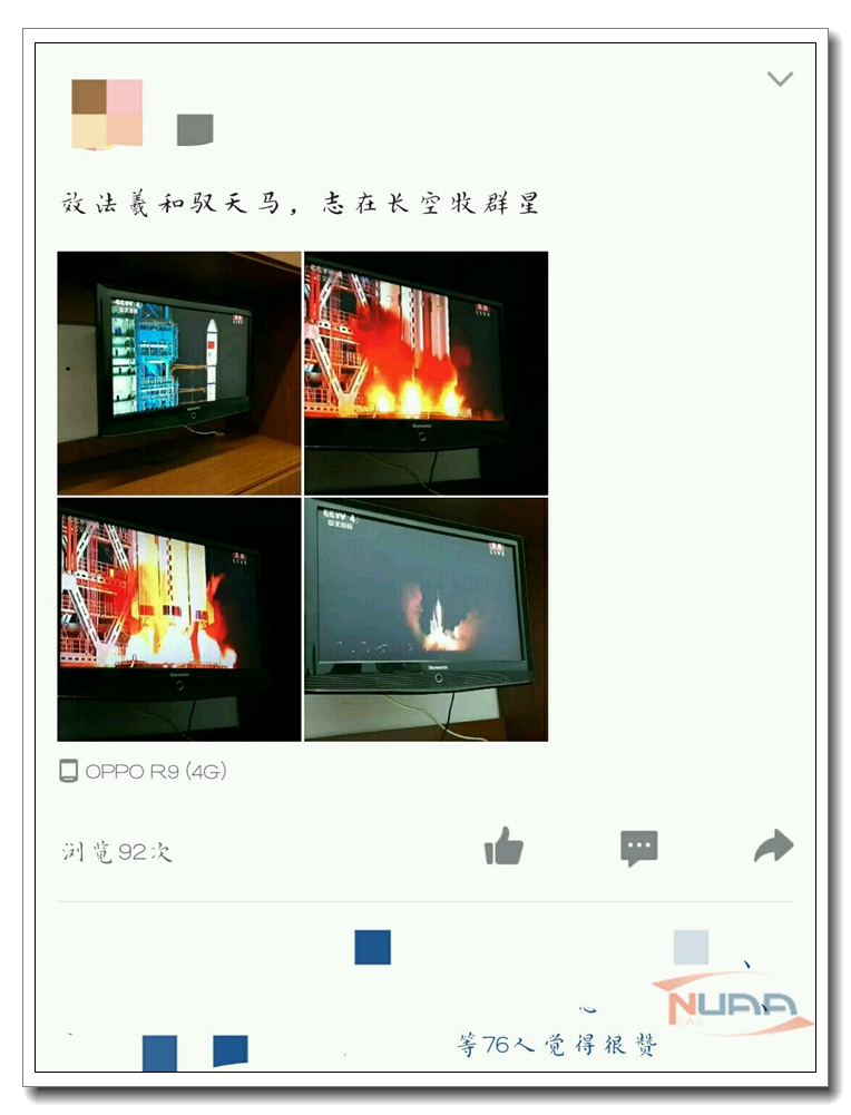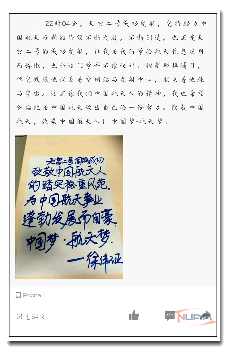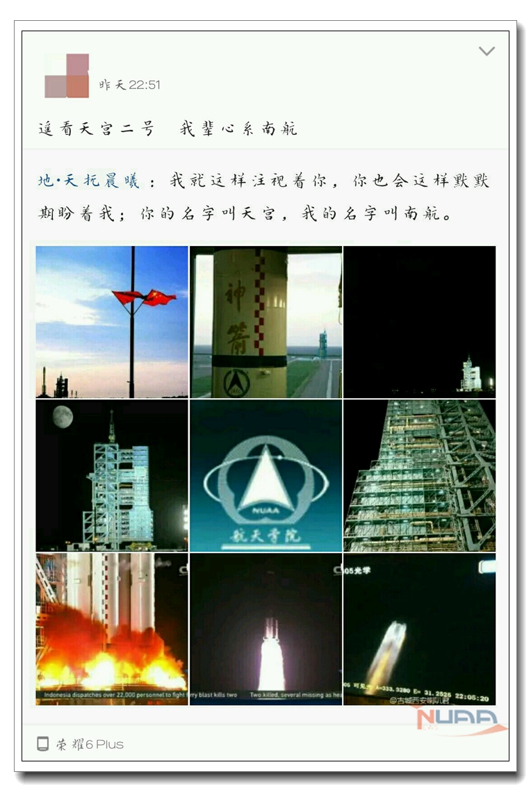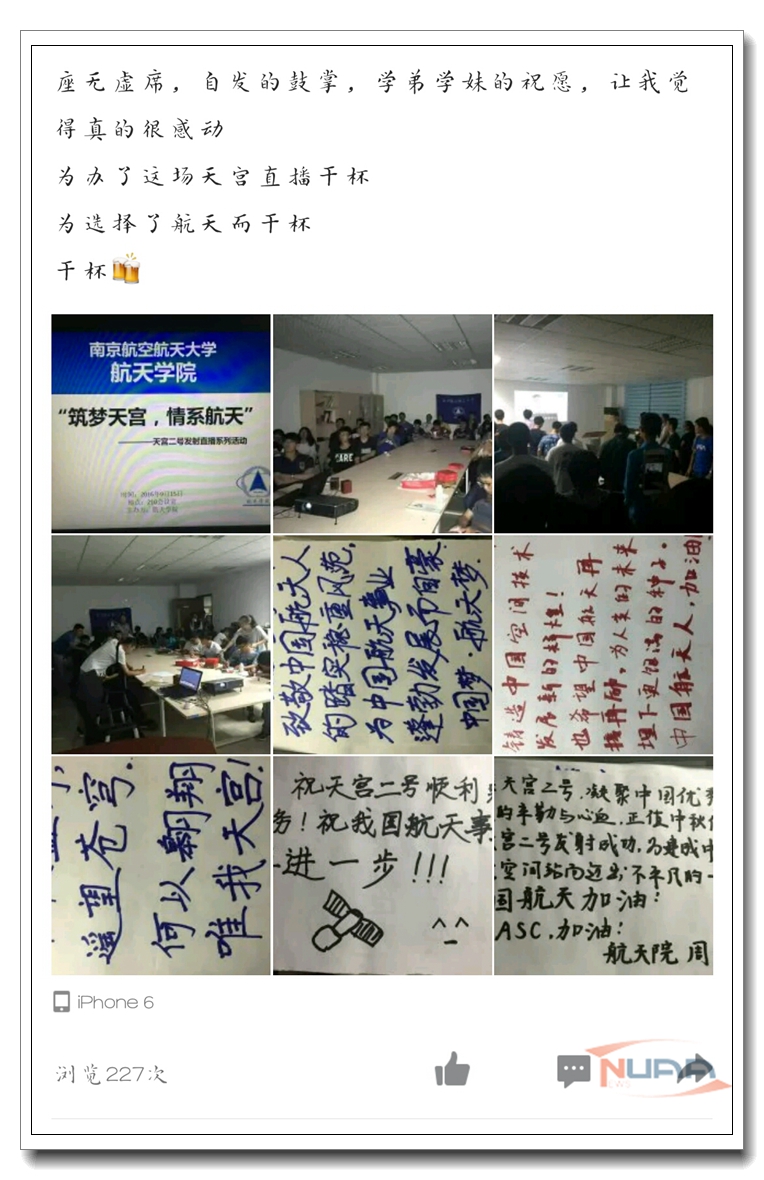 2016 年9月15日21点10分,正值我国天宫二号空间实验室发射,航天学子自发组织到学工楼210一起观看发射直播,共同见证这令人欢欣鼓舞的时刻。 ![]() 开始,同学们在津津有味的观看天宫二号的宣传片,了解天宫二号的任务使命和研发背后的过程。辅导员徐伟证也结合专业课程,为同学们介绍了中国空间站的建设历程,天宫一号、二号的使命发展,空间交会对接、空间环境下的基础科学实验等内容,更加激发了同学们期待见证天宫二号升天的热情。 ![]() 发射场做最后的检测过程,同学们内心都是紧绷着的。10点04分,随着一声“点火”指令,火箭燃料迅速喷射,腾空而起,令同学们眼前一亮,心潮澎湃。火箭继续升空,平稳运行,听着来自各个发射控制中心和测控中心一串串的正常汇报,大家都为中国航天人踏实稳重、严谨认真的风范所折服,也深刻感受到中国航天人“特别能吃苦,特别能战斗,特别能攻关,特别能奉献”的航天精神的精髓。 ![]() 天宫二号与长征二号F火箭脱离,平稳的在太空中展开太阳翼。 空间实验室飞行任务总指挥长张又侠宣布:“天宫二号”空间实验室发射任务取得圆满成功。在场同学们起立鼓掌,为这一刻深感骄傲和自豪。 有些航天学子未能赶到学工楼210一起观看,自发在寝室集聚,共同见证祖国航天事业迈出坚实步伐的这一刻。天宫二号发射成功后,同学们纷纷在朋友圈和空间表达自己观看发射直播的感悟和思考,为自己是一名航天学子而深感荣幸,期待自己将来能为航天事业的发展作出贡献。情系天宫,筑梦航天,天宫二号,我们为你骄傲! ![]() ![]() ![]() ![]()