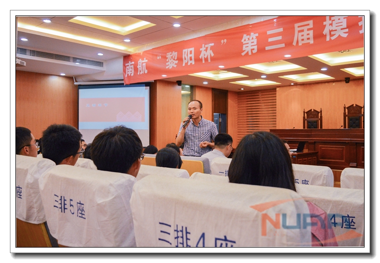 9月23日晚7点,南航“黎阳杯”第三届模拟庭审大赛在人文学院模拟法庭成功举行。本次庭审大赛由南航大学生法律援助中心及2014级法班联合主办,2016级法学新生进行观摩学习。人文学院党委书记张启钱、玄武区检察院研究室主任韩立勇、校团委副书记张亚丽、保卫处副处长缪长宗、学生处张跃老师、宣传部寇晓洁老师、南航大学生法律援助中心高志宏副教授担任评委。