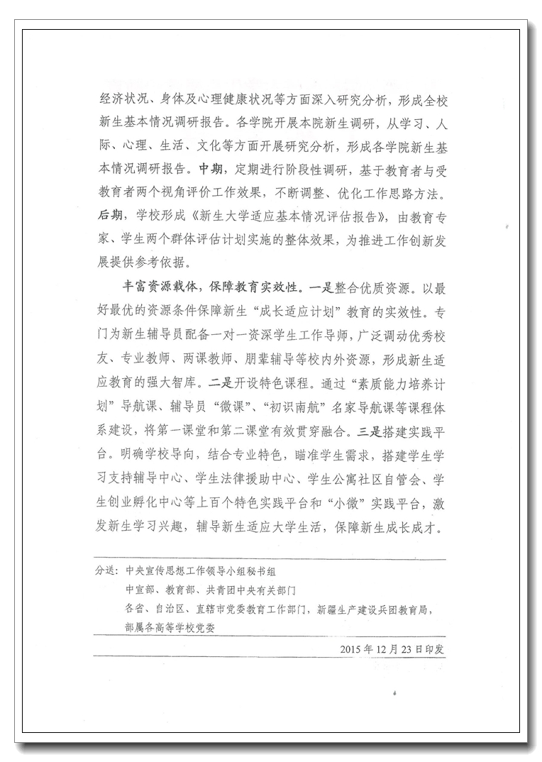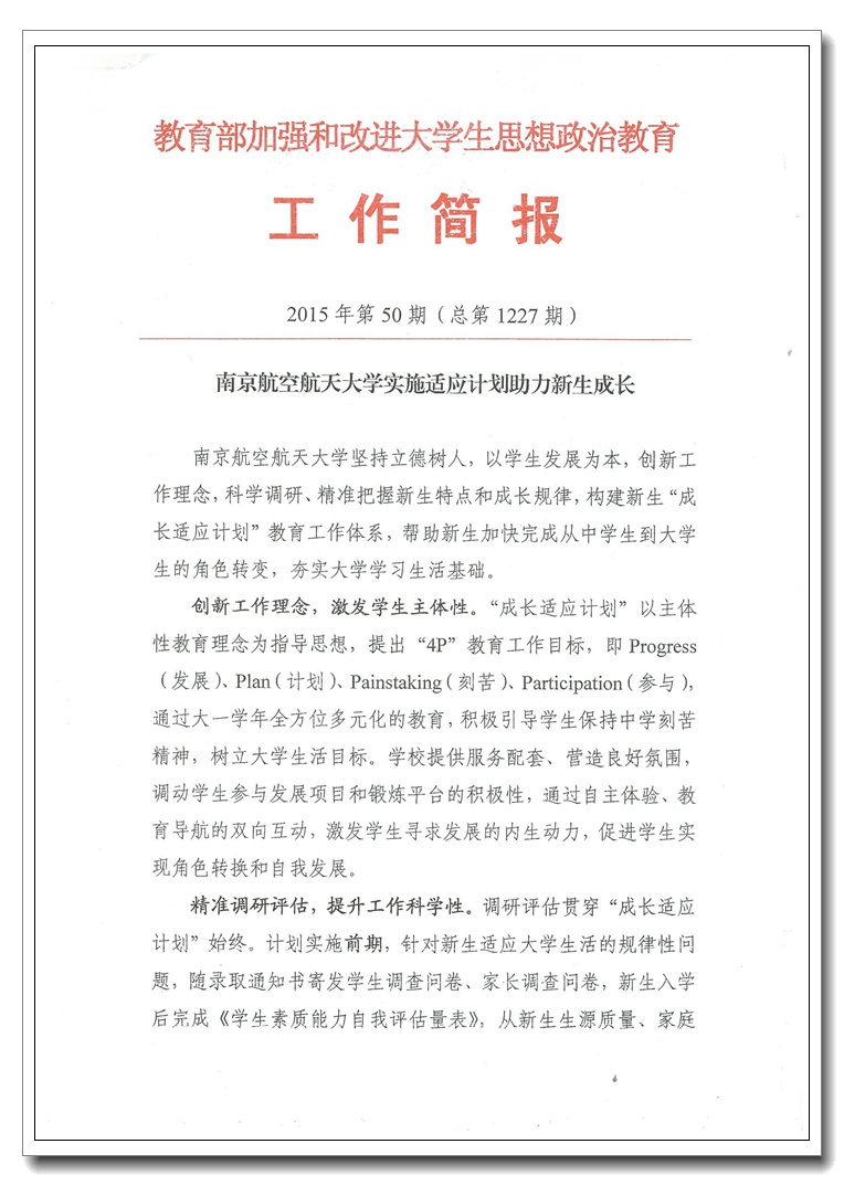 我校“成长适应计划”以学生发展为本,创新工作理念,科学调研、精准把握新生特点和成长规律,构建新生“成长适应计划”教育工作体系,帮助新生加快完成从中学生到大学生的角色转变,夯实大学学习生活基础。曾受教育部简报专题报道。