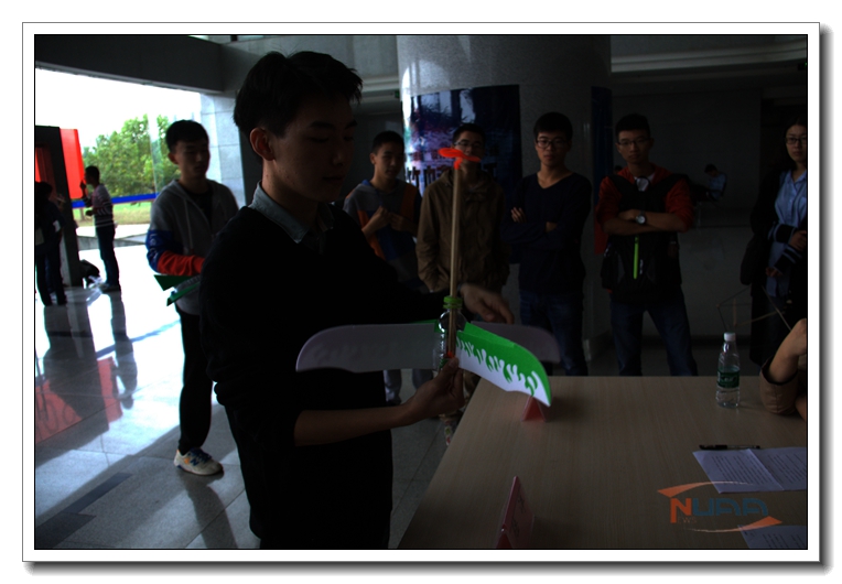 比赛当天,很多本部的学生来到江宁参加比赛。比赛现场,同学们都小心翼翼地拿着自己的作品参加比赛。作品介绍,上好皮筋,松手,飞翔,看着一架架竹蜻蜓不断飞入空中,同学们的热情也越来越高涨。有几个优秀的作品在空中悬停长达12秒,引来观众的惊叹与赞赏。也有作品飞行得特别平稳,落点误差几乎为0。现场最夺人眼球的莫过于竹蜻蜓的形状,摆脱了传统竹蜻蜓形状的束缚,同学们大胆想象,设计制造了包括拥有4支旋翼、两只旋翼、飞鸟形状等等众多竹蜻蜓。同时将自己所学专业知识融入设计的竹蜻蜓,设计了包括同轴反转式样的、加装降落伞式样的、火箭式样的等多种充满智慧和思考的竹蜻蜓。