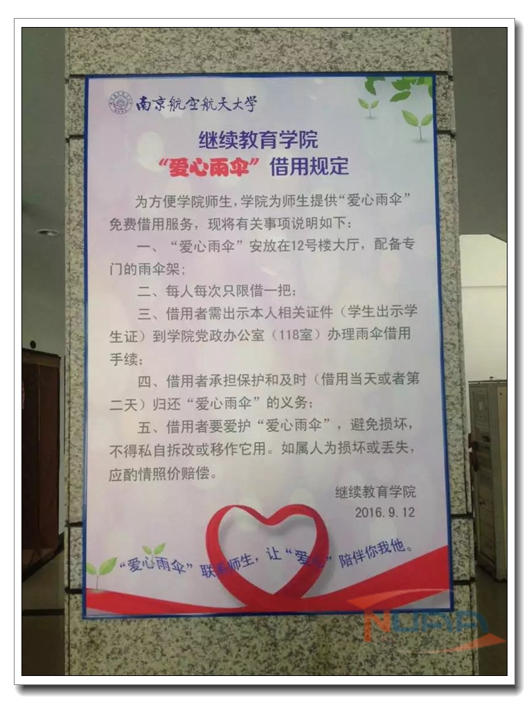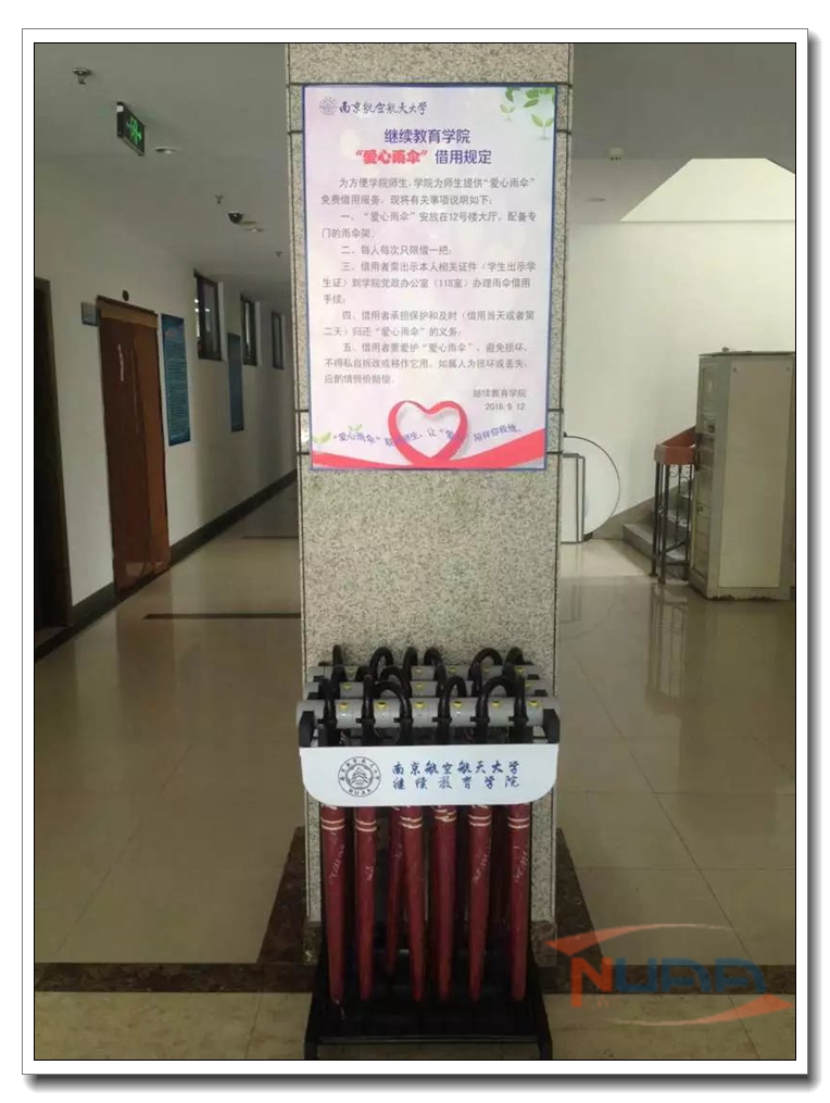 “爱心雨伞”的伞架,表面印有继续教育学院图案、标志,是学院机关部分教师利用午休时间自己组装、制作的,传递了学院老师的涓涓爱意,浓浓爱心。爱心伞的设置,不仅仅是为了方便师生,让师生受用,更是为了使爱心得到更广泛地传播,培养的诚信品格和社会公德意识,提高学院的文明形象,使文明之花处处开放。