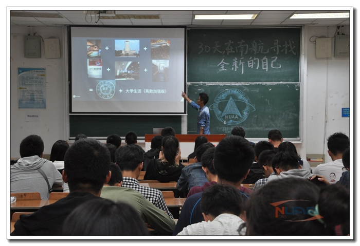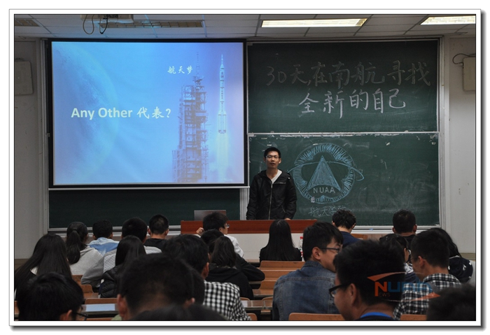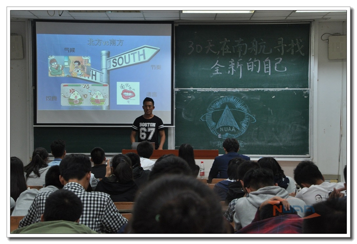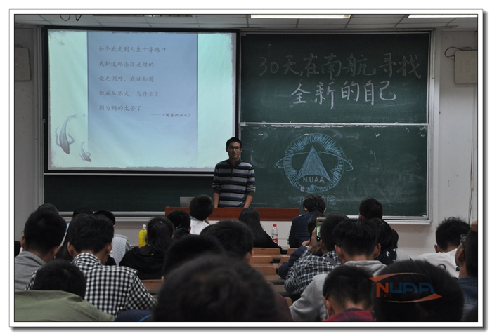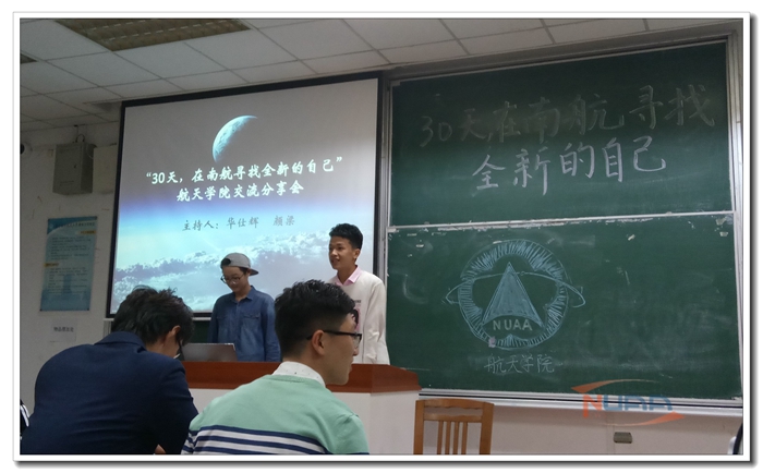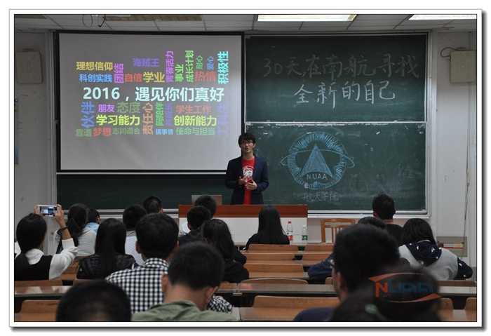 “30天,在南航寻找全新的自己”开学季系列活动有序开展近一个月, 10月22日晚上6点半,航天学院2016级在6201教室组织了“30天,在南航寻找全新的自己”年级分享会,新生们分享自己在南航30天的收获和成长,展望对未来的期待。 分享会伊始,播放了对同学们的采访视频,展示各位受访同学的风采。随后各班级代表陆续上台分享,主要从“融入新文化”、“适应新环境”、“结识新伙伴”、“开启新学业”这四个主题对自己在南航的感受与收获进行分享。同学们或谈自己家乡与南航的气候、人文、饮食等不同,或谈入学来军训、学生组织、各项活动的体验,或谈自己班级文化建设、对学院航天特色的感触和对航天文化的认识和理解等。同学们纷纷展示了自己的幽默风趣、深厚的文化底蕴、深刻的思想和乐观向上的精神风貌,其乐融融。最后辅导员做了认真的总结,也对新生们学习生活提出建议与要求,号召大家一起成为能为人类航天事业做出卓越贡献的中国航天人。 此次活动中,新生们感受到了自己在南航三十天的满满收获,并对今后在南航,在航天学院的学习生活充满期待。