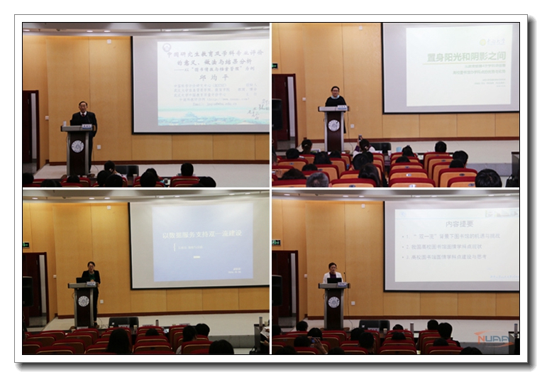 武汉大学中国科学评价研究中心创始人、武汉大学信息管理学院博士生导师邱均平教授做了题为《中国研究生教育及学科专业评价的意义、做法与结果分析》学术报告,他以“图书情报与档案管理”专业为例,从评价目的与意义、指导思想与原则、对象与指标体系、数据来源与处理、评价结果与分析、评价结论与启示等方面对我国研究生教育及学科评价进行了深入系统分析。东南大学图书馆教研室主任,研究馆员袁曦临老师《置身阳光和阴影之间——从教育部第四次学科评估看高校图书馆办学科点的优势与劣势》报告中,回顾了东南大学图书情报与档案管理硕士学科点的办学历史,阐述了学科评估的要求,分析了学科的优势与劣势,并对学科点办学提出了几点思考。南京乐致安信息技术有限公司副总经理赵荣荣《以学科发展服务支持“双一流”建设——乐致安探索与实践》报告中,介绍了乐致安公司作为信息技术企业,以学科发展服务支持高校“双一流”建设的方法和经验。南航图书馆发展研究室主任、副研究馆员邹小筑老师《面向需求,学术引领,服务创新——高校图书馆学科点特色发展思考》报告中,探讨了“双一流”背景下图书馆的机遇与挑战,阐述了我国高校图书馆图情学科点现状,从师资、科研、生源、培养方式等方面对高校图书馆图情学科点建设进行了深入分析,并提出对策和思考。