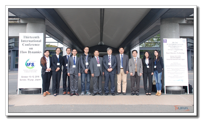 与会代表同时参加了2016年10月10日至12日在日本仙台召开的第十三届流体动力学国际会议(The 13nd International Conference on Flow Dynamics(ICFD2016))。ICFD是由日本东北大学流体科学研究所于2004年倡导召开的系列国际学术会议,每年10月在日本东北大学举办。本次会议为期三天,来自25个国家和地区的600多名代表参加了会议,多名国际知名专家做大会主题报告。今年该会议有20个分会议题, The 2nd NUAA-Tohoku University Joint Symposium on Fluid Science, Aerospace Engineering and Smart Structure Technology为其中的Organized Sessions 15 。