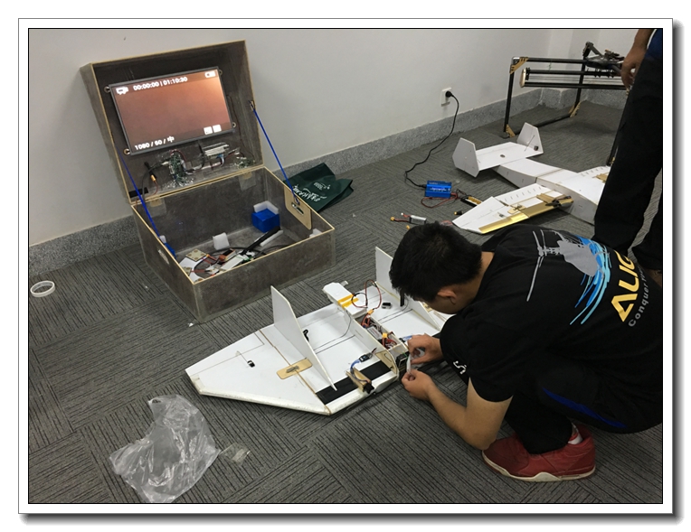 参加模拟搜救任务的一支队伍是由刘晨曦、庄志炜、王储和李宇飞同学组成,他们都是首次参加比赛。队员们花了包括整个暑假在内的3个多月的时间,制作设计制作出比赛抓球用的机械臂和专用飞机脚架,调试完成两架比赛用机。9月15日进行了针对比赛的飞行训练,训练中注重了4人的整体配合。 ![]()