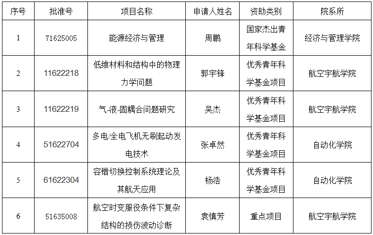 表1. 2016年度我校NSFC资助的标志性项目清单