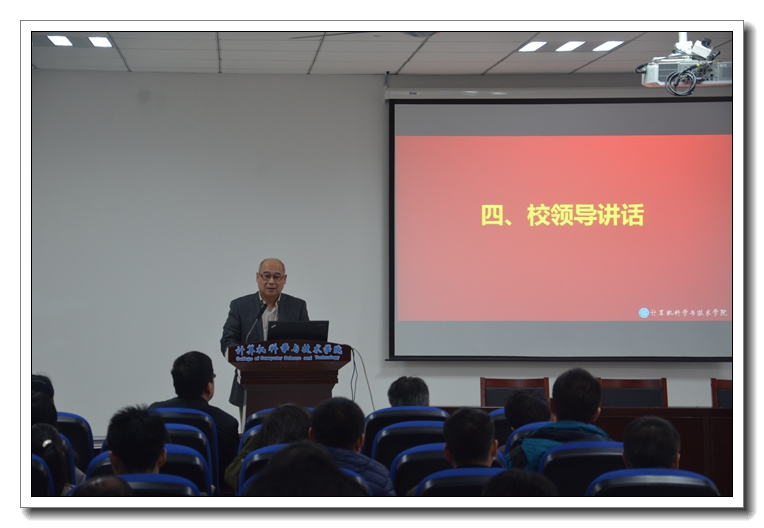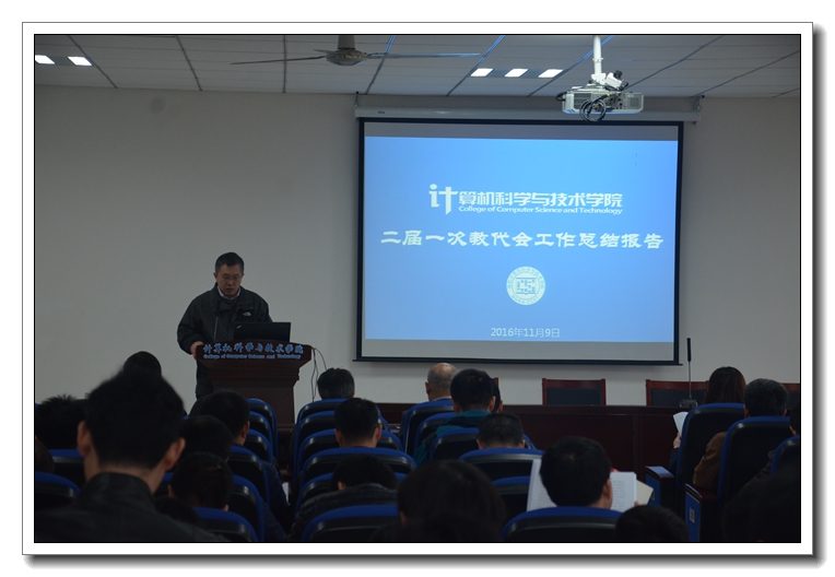 1月9日,计算机科学与技术学院二届一次教职工代表大会暨工会委员会(扩大)会议在学院楼隆重召开。校党委常委、副校长黄志球,工会副主席褚峥应邀出席会议。院党委副书记王霄主持会议。 大会在嘹亮的《国歌》声中开始。院党委书记江国华在致辞中表示,过去几年,院教代会和工会组织围绕推进民主建设、打造教工之家、营造和谐氛围等做了大量工作,为推动学院建设发展作出了重要贡献。希望今后更好地发挥作用,进一步推进民主管理与监督,汇聚集体智慧和力量,为实现“十三五”奋斗目标和“双一流”建设任务而不懈努力。褚峥老师也代表校工会对大会的顺利召开表示祝贺,对院工会几年来的辛勤工作表示感谢。 会议听取和审议了陈兵院长所作的工作报告。他从学科平台建设、人才培养质量、科学研究水平、师资队伍结构、教育教学改革、国际合作交流、党建和政治思想工作等方面总结了学院五年来取得的成绩和未来面临的挑战,表示在学校全面推进“双一流”建设和持续深化综合改革的背景下,学院将坚守责任和使命,坚持创新驱动,在服务支撑国家重大发展战略、服务国防、服务区域经济和学校“双一流”建设的过程中实现新的发展。