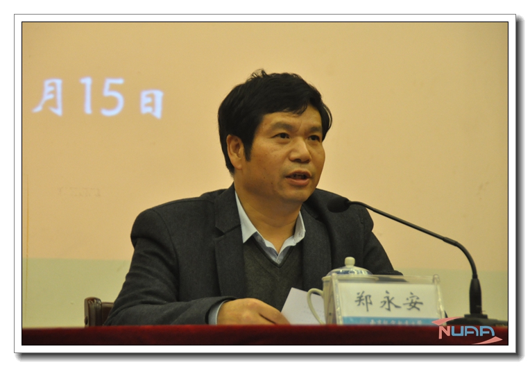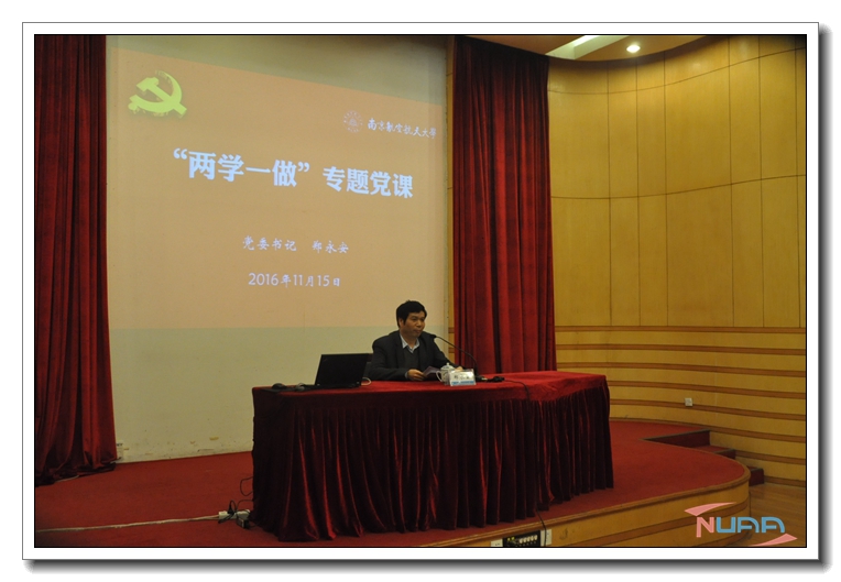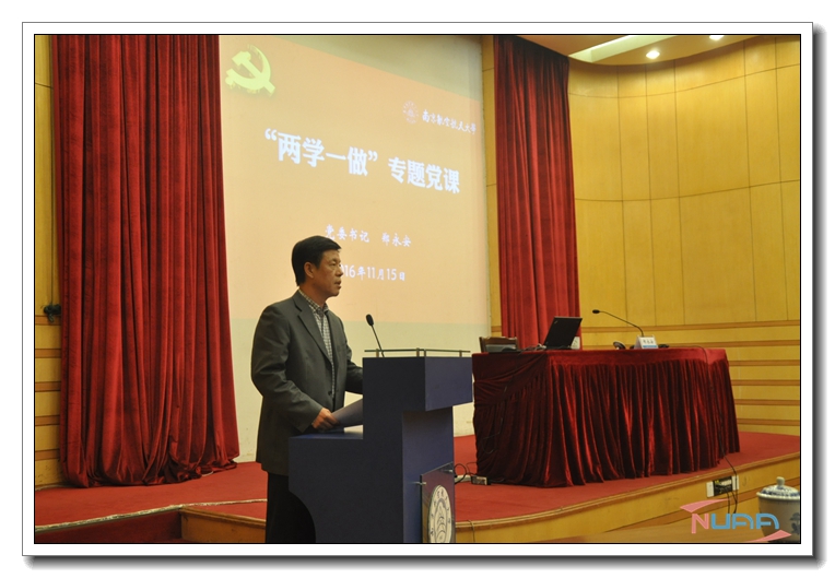 郑永安指出,理想信念是一个政党治国理政的旗帜,是一个民族奋力前行的向导,也是每一位共产党人安身立命的根本。各级党组织和广大党员干部要坚定理想信念,牢记誓词,不忘初心,进一步拧紧理想信念这个“总开关”,进一步把握党与时俱进的“总旋律”,进一步尊崇党章这个“总规矩”,坚守住共产主义远大理想,传承好党不断把崇高理想转为伟大实践的执着信念,肩负起南航作为一所社会主义大学新时期改革发展重任。 郑永安指出,党和国家发展的历程告诉我们,办好中国的事情,关键在党。南航改革发展取得的成绩也告诉我们,办好南航的事,离不开各个党组织和广大党员作用的发挥。作为党的一级基层组织,我们的一个重要责任就是要把南航全体师生员工团结在一起,凝聚在一起,带领大家朝着共同的目标负重奋进,一往无前地开创南航更加美好的明天。他强调,无论是南航新时期党的建设要求,还是南航新时期改革发展的实践重任,都需要我们准确把握“全面从严治党”的新常态。“全面从严治党”对全党上下的政绩观进行了价值纠偏,“抓好党建是本职、不抓党建是失职、抓不好党建是渎职”,是今后考核党建工作成效的一个硬指标。各级党组织把管党治党作为首要责任承担好落实好,把党建工作和中心工作一起谋划、一起部署、一起考核,是“全面从严治党”新常态的实践要求。