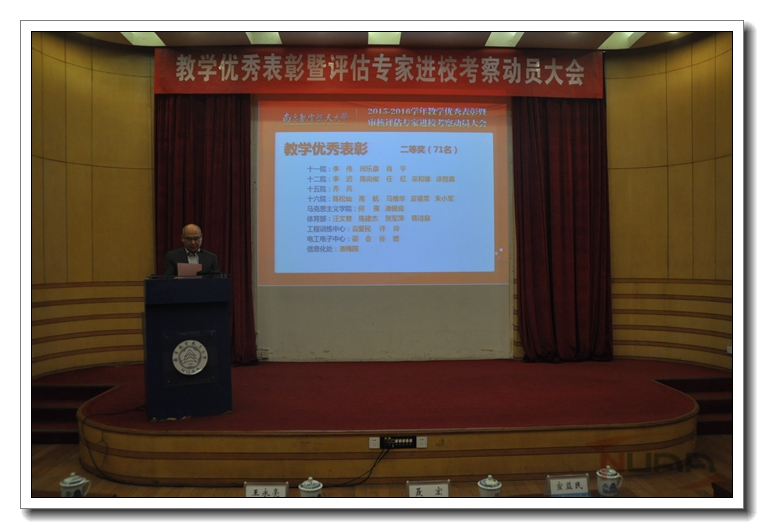 11月17日下午,2015-2016学年教学优秀表彰暨审核评估专家进校考察动员大会在明故宫校区召开。校长聂宏为获奖代表颁奖,副校长黄志球宣读表彰决定。副校长王永亮主持会议。全体校领导、校长助理,各学院院长、书记、教学副院长、副书记、专业负责人,全体教学优秀奖获奖者,机关部处及直属单位主要负责同志出席会议。