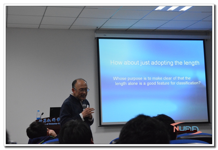陈松灿教授讲述了“识别模型选择中的原则和智慧”,他通过生活中的事例,形象地把比较晦涩难懂的专业术语、定理、名词解释成通俗易懂的语言如:“丑小鸭定理”、“没有免费午餐”等等,使整场专业讲座变得趣味盎然,引得在场的同学们掌声阵阵,积极互动。诸如“过拟合”、“偏好”等术语,陈教授也通过学习过程中是否有“平常作业练习”,其“考试”结果截然不同来加以说明,并借此勉励大家平时多做相关作业练习,并且全面复习,以期在考试中都有不错的成绩。