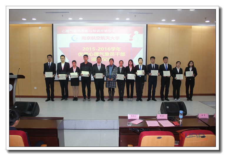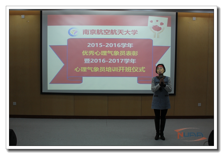 12月10日上午,由学生处主办、校心理健康教育中心承办的南京航空航天大学2015-2016学年优秀心理气象员表彰大会暨2016-2017学年气象员培训开班仪式在将军路校区图书馆报告厅举行。江苏省大学生心理健康教育专家指导委员会委员江苏省大学生心理专业委员会副主任陶爱荣教授、我校心理健康教育中心全体老师、全体心理辅导员老师、获奖同学代表以及2016级163名心理气象员参加了本次活动。心理健康教育中心陈瑜老师主持了本次会议。