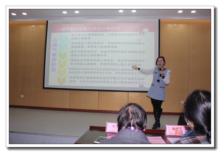 ![]() 陈瑜老师从历史沿革、服务宗旨、LOGO寓意、组织架构、工作职责、特色活动等方面向大一气象员们介绍了我校心理气象站的工作开展情况,使在场的新晋气象员进一步加深了对工作的认识。