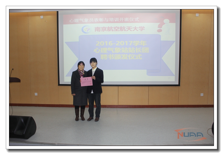 ![]() 杨雪花老师宣读了《南京航空航天大学关于表彰2015-2016学年优秀心理气象员及干部的决定》,并为各学院优秀心理气象员代表颁发了荣誉证书。陶爱荣教授为各学院优秀心理气象员干部代表颁奖。此外,今年新当选的3名心理气象站校站的站长团成员以及14名学院心理气象分站大一年级负责人还在会上接受了心理健康教育中心颁发的聘书。