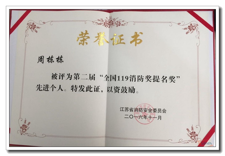 近日从江苏省消防安全委员会获悉,我校保卫处消防科周栋栋科长荣获了第二届“全国119消防奖提名奖”先进个人荣誉称号,成为全省高校唯一入选者。