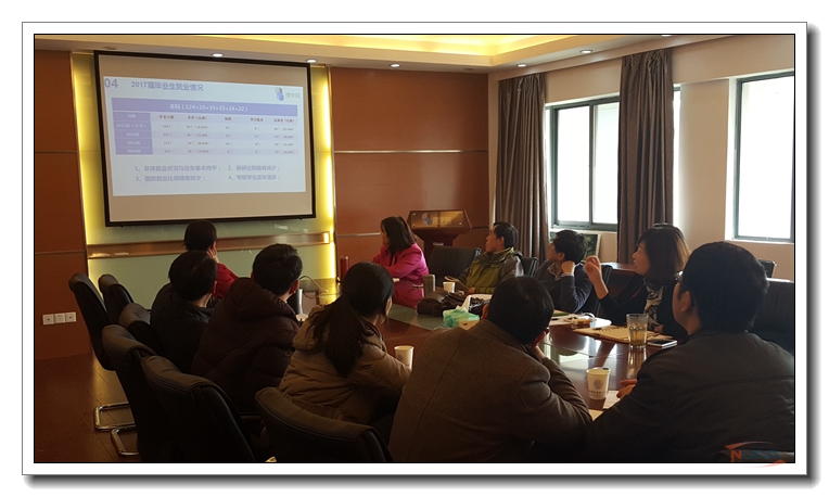 最后,王静汇报了2017届毕业的就业情况,理学院就业工作面临本科生考研人数、研究生教师考编人数逐年增加的现状,用人单位要求逐年增高,国防单位招聘指标缩减,就业工作形势较为严峻。施大宁对毕业生就业工作提出了要求,他说,全院上下要统一思想、全员参与、不怕困难,挖掘资源,努力拓宽毕业生的就业渠道,以保质保量地完成2017届毕业生就业工作。