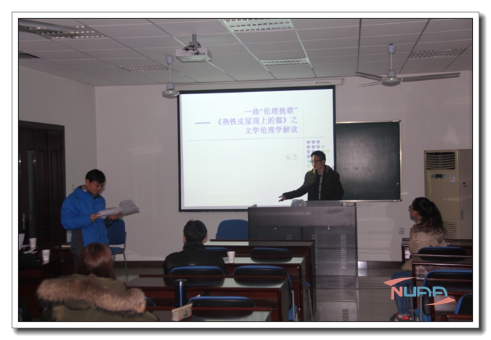 首先,学术论坛院负责人及辅导员闫闻对本次活动的概况进行了介绍,并预祝此次“枭龙杯”研究生学术论坛外国语学院分论坛能取得圆满成功; 接着,是获奖同学们的优秀发言及问答过程。宋杰同学以《一曲“伦理挽歌”——<热铁皮屋顶上的猫>之文学伦理解读》,从伦理身份、伦理选择及伦理意识三个方面解读了该问文章的伦理,赢得了老师和同学们的高度赞扬。姜老师也对该论文进行了点评。他指出宋杰同学的论文写作对象清楚、视角明确、理论视角清晰,是一篇典型的从伦理视角来研究文本的文章。