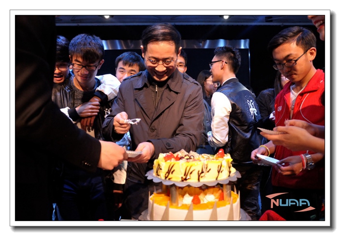 活动的下半场是晚上精彩的迎新年晚会,师生们进场时纷纷在签名墙上签名留念。晚会上,精彩节目让全场师生们目不暇接,激情四射的舞蹈,搞怪逗逼的玩偶戏,幽默诙谐的相声,积极励志的朗诵……。由航天学院青协带来的《祝航天学院十周年生日快乐》视频将晚会推向了高潮。晚会的最后环节为大家带来了彩蛋——共有9名12月过生日的师生上台与学院共庆10岁生日,在蛋糕前,大家共同庆生,在全场共唱的《祝你生日快乐》的歌声中,晚会圆满结束。