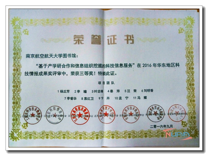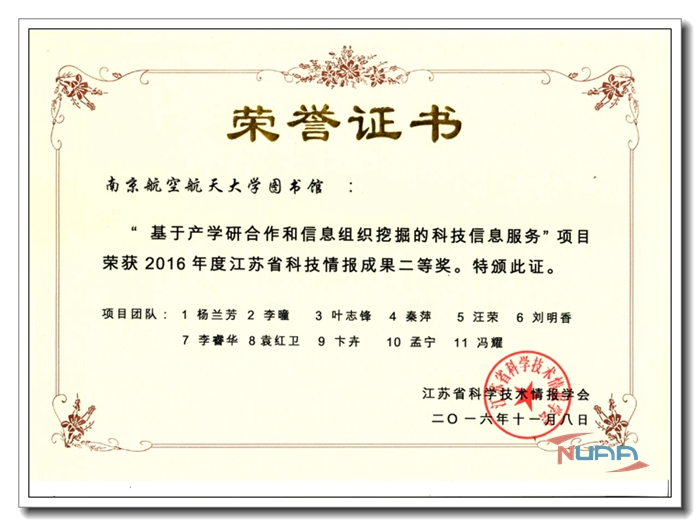 此外,江苏省科学技术情报学会向华东地区科技情报成果奖评审组推荐30项成果,其中12项获得华东地区科技情报成果奖,图书馆项目荣获三等奖。