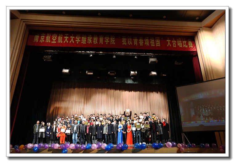 为增强同学们的爱国热情和集体荣誉感,由继续教育学院团委主办,院学生会承办的第二届“我以青春颂祖国”大合唱决赛于2016年12月22日晚7时在明故宫校区新大学生活动中心举行。学院党委书记聂东林、校党委宣传部副部长孔令华、校人事处副处长卜建、校保卫处副处长缪长宗、学院党委副书记涂志宏出席活动,学院团委负责人和辅导员等也参加了活动。 决赛在雄浑激昂的《保卫黄河》中拉开帷幕。来自各个团支部的代表队以一种蓬勃向上的朝气亮相比赛现场,轮番展示了他们精心编排的合唱曲目,为观众们带来了一场精彩的视听盛宴。高亢嘹亮的《精忠报国》、情感真挚的《中国军魂》、激昂奋进的《歌唱祖国》……各代表队独具匠心的编排和激情四射的表演,一次次将现场观众带到歌曲的世界里,大家在欣赏和感动中分享着继续教育学院师生对革命先驱的崇高敬意和对祖国母亲的深深眷恋。整场比赛气氛热烈,掌声阵阵。比赛结尾,由辅导员和学生干部代表带来的表演曲目《相亲相爱一家人》,更是将比赛推向了最高潮,赢得了全场一阵阵的欢呼和喝彩。。