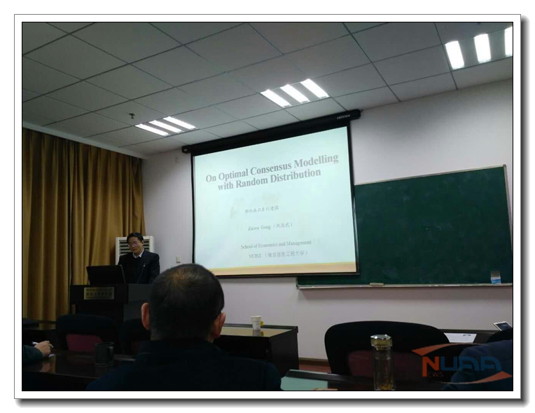 2016年12月23日下午14:30至15:30,在我院704教室,南京信息工程大学巩在武教授受经管学院灰色系统研究所和智能决策与风险分析研究所的邀请,作了题为“On optimal consensus modelling with the random distribution”的学术报告。经管学院的老师以及学生积极地参加了此次报告。 巩在武教授此次报告的主要内容为群体共识系列建模,首先介绍了共识的概念,提出了协调者和决策个体的概念,运用不同效用函数描述不同人的偏好,构建了带有社会偏好的网络模型。从最低成本角度出发,探讨了不同情况下,模型的求解方法与其经济意义,令在座师生受益匪浅。报告结束后,广大师生积极与巩在武教授进行了进一步的交流与沟通,学术报告在轻松愉悦的氛围中圆满结束。 巩在武教授是气候变化与公共气象、管理科学与工程专业的硕士生导师。同时也是Natural Hazards客座主编,中国运筹学会不确定分会常务理事,中国运筹学会智能分会常务理事,中国运筹学会决策科学分会理事,中国运筹学会企业运筹学分会理事,中国优选法统筹法与经济数学研究会灰色系统专业委员会理事,中国灾害防御协会风险分析专业委员会理事,南京信息工程大学经管学院副院长。2009年入选江苏省高校“青蓝工程”骨干教师培养对象,2012年入选江苏苏省高校“青蓝工程学术带头人”培养对象,2012年入选江苏省333人才工程第三层次人选;2014年入选江苏省第六期“六大人才高峰”培养对象。目前主持国家自然科学基金三项(其中一项结题),教育部人文社科基金一项,江苏省自然科学基金面上项目一项。主要从事不确定性决策理论、灰决策理论、气象灾害风险评估等方面的研究。 ![]()