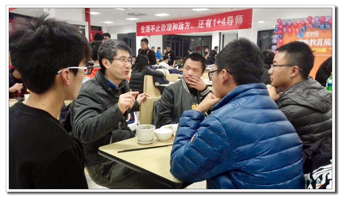 一顿热气腾腾的饺子,一次“非诚勿扰”式的师生结对,一声真挚的宣言,一张相伴四年的全家福。12月27日晚,理学院2016级139名学生与40余位老师齐聚和园食堂,2016级“1+4”导学起航行动正式拉开帷幕。 本次活动的主题为“饺子·教子·骄子”,意寓通过师生互动“包饺子”、抽签结对,形成1名老师对一个寝室4位学生的长期指导团队,4年一贯制担负起“教子”重任,指引学生成为明日的“骄子”。活动在16级学生精心准备的开场舞《高数舞》中开始,接着,理学院院长施大宁、党委书记余春玲为本次指导2016级数学系、物理系的31名指导老师颁发了《理学院“1+4”导学起航行动学业导师聘书》。参加本次起航行动的老师包括了学院领导、各系部主任、支部书记、班主任、任课教师、青年教师,其中,教授、副教授所占比例达80%,“与教授为友”成为传承理学院师生携手共发展的优秀传统。